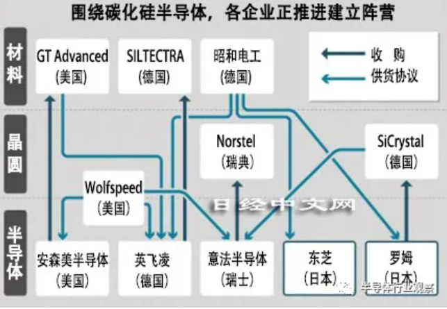 半导体企业间还出现了通过併购(M&A)与材料厂商推进“垂直整合”的动向。功率半导体份额居世界第2位的美国安森美半导体(ON Semiconductor)8月宣佈,将以约460亿日元的价格收购一家从事碳化硅生産业务的美国公司。罗姆也于2009年收购碳化硅晶圆制造商德国SiCrystal,阵营的构建有望进一步取得进展。